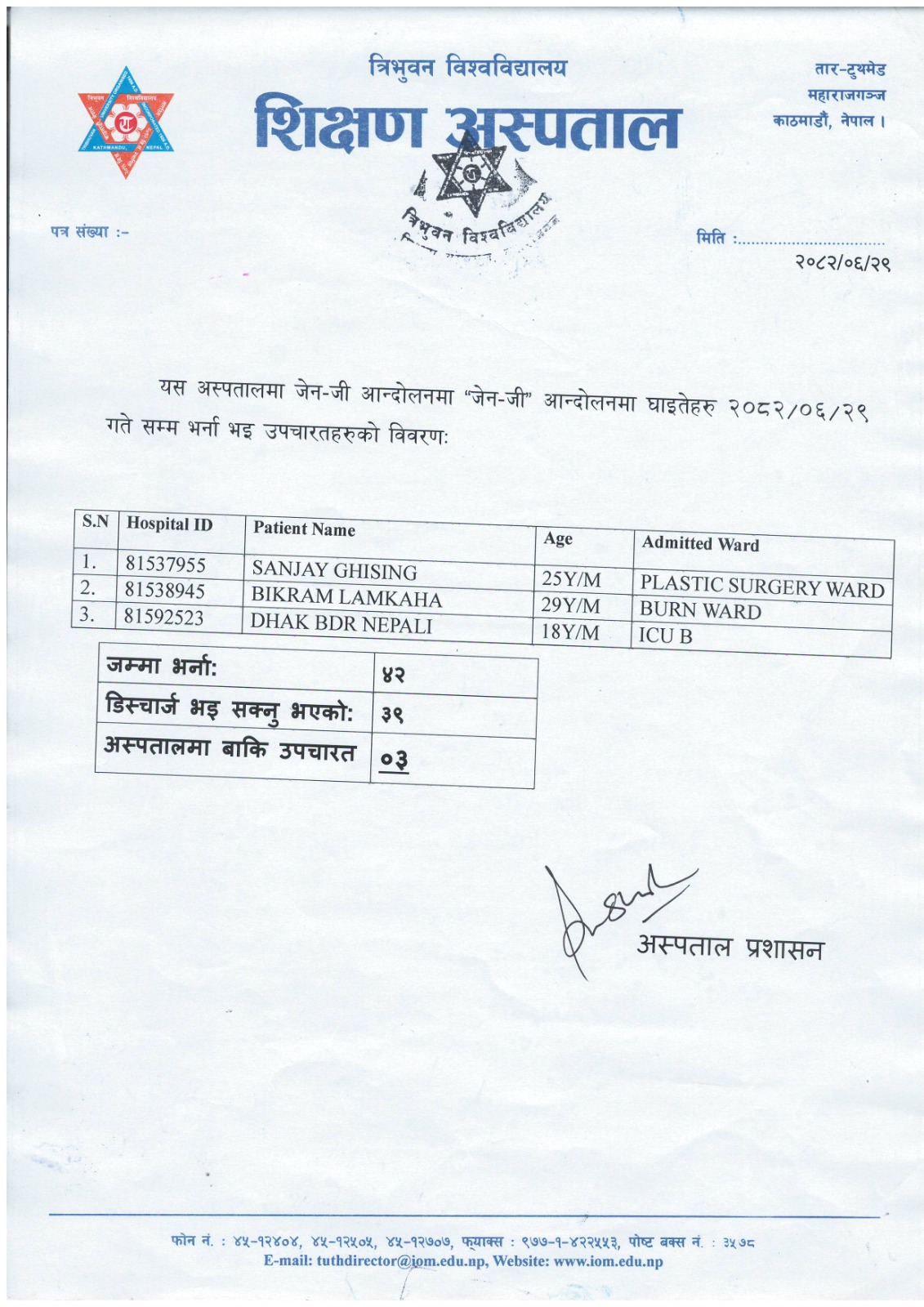 जेन-जी आन्दोलन मा घाइते भई उपचारत २०८२/०६/२९ गते सम्म को विवरण